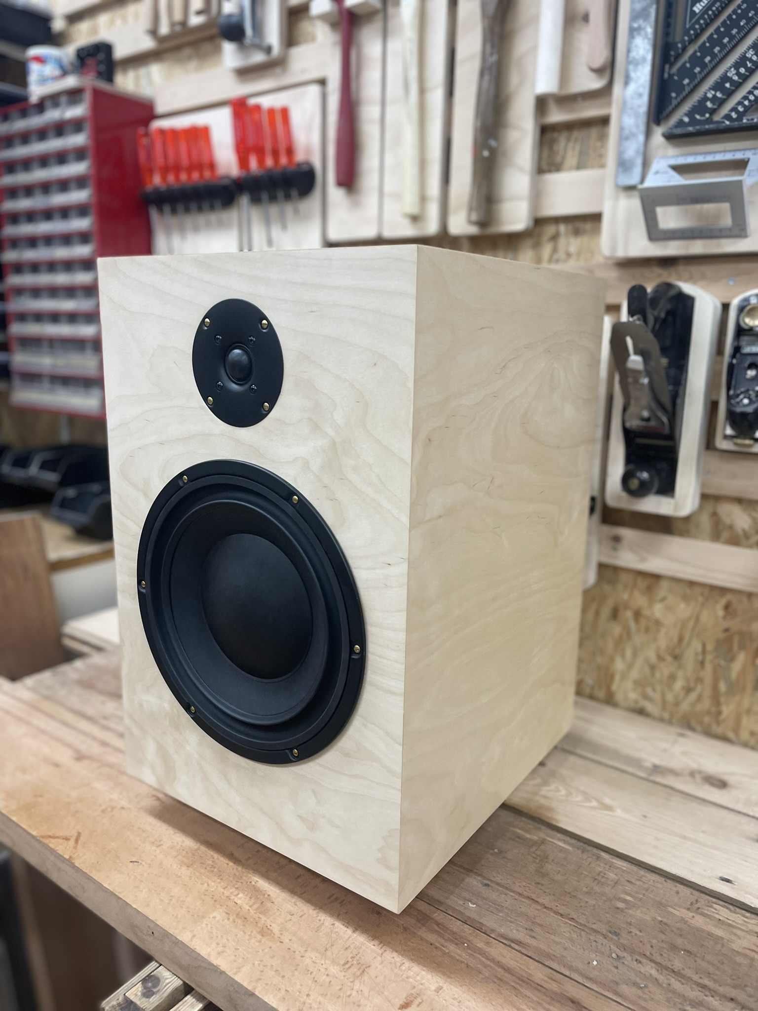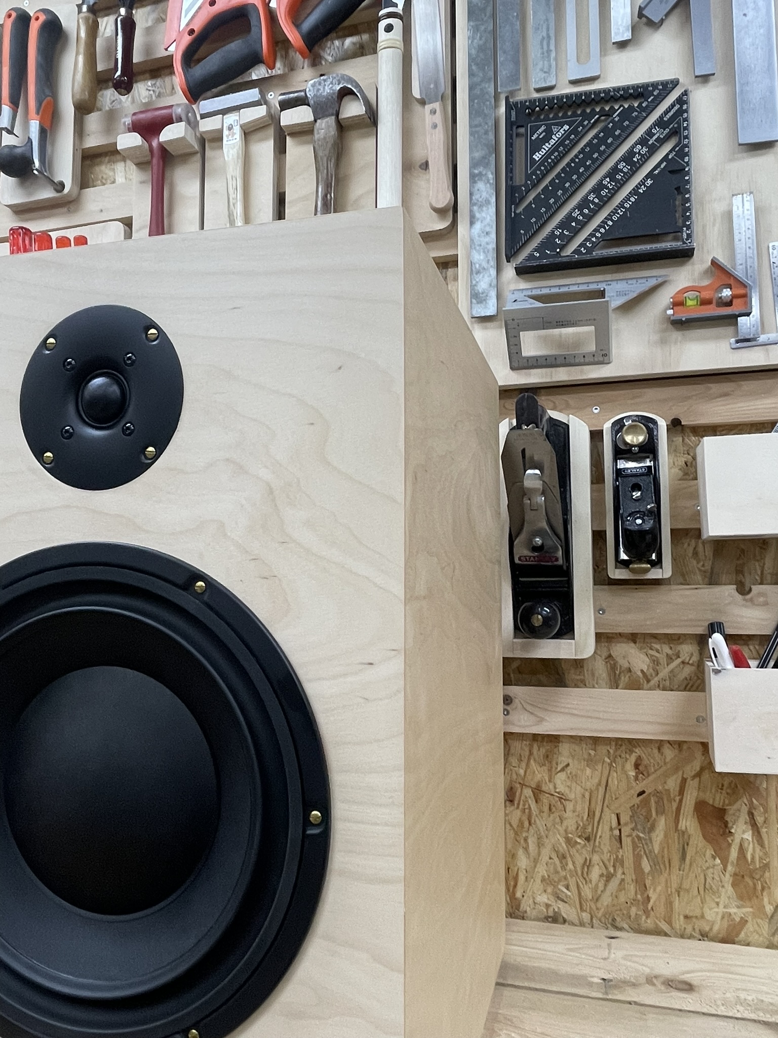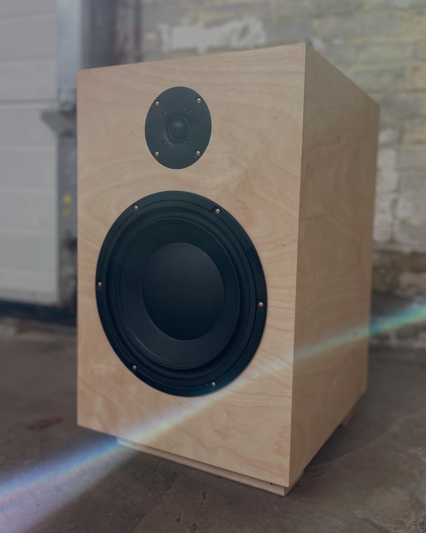 Hiervoor heb ik 22 mm dik MDF gelamineerd met een licht berken fineer. De oude messing schroefjes vormen een leuk contrast met de moderne strakke look van de speaker. Door de afwerking met Rubio Monocoat Oil Plus 2C wordt de houtnerf mooi geaccentueerd terwijl het een goede bescherming biedt.